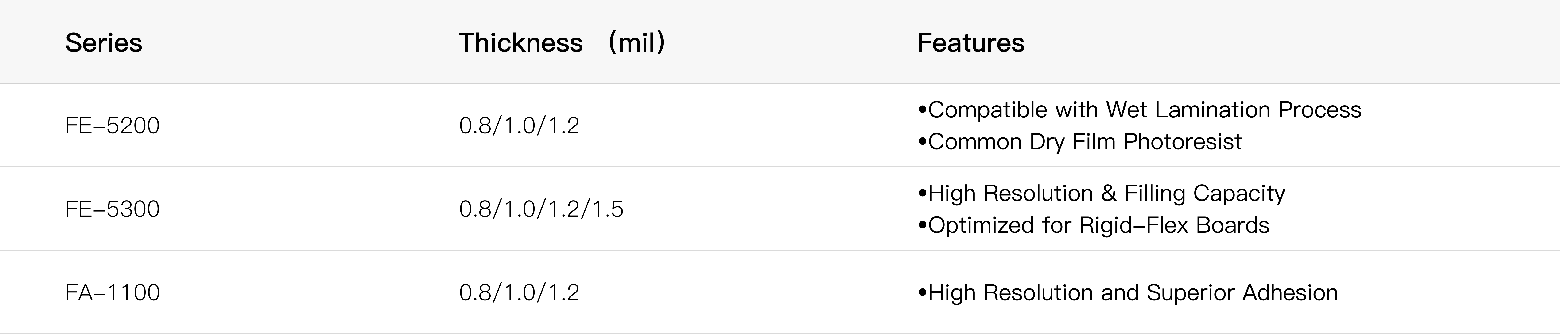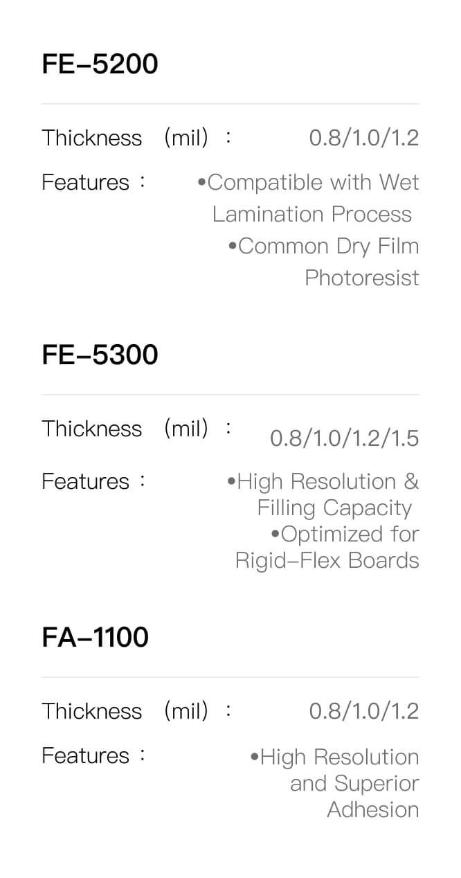 These Dry Film Photoresist(DFR)are aqueous processable photosensitive film newly developed for FPC,which are excellent in adhesion, resolution and stripping property.