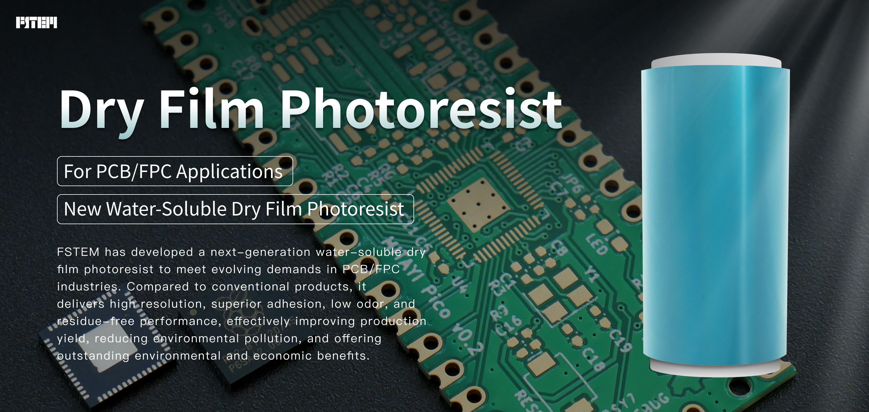 FSTEM has developed a next-generation water-soluble dry film photoresist to meet evolving demands in PCB/FPC industries. Compared to conventional products, it delivers high resolution, superior adhesion, low odor, and residue-free performance, effectively improving production yield, reducing environmental pollution, and offering outstanding environmental and economic benefits.
